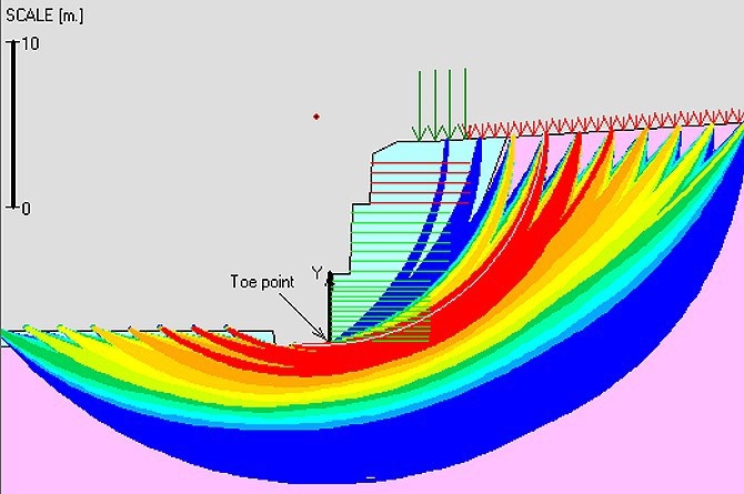 Projekt bloku gruntu zbrojonego został wykonany zgodnie z brytyjską metodyką projektową Tieback Wedge (BS 8006). Rozkład sztywności elementów zbrojących po wysokości konstrukcji według tej metodyki uwzględnia wymagania projektowe dotyczące zachowania deformacyjnego konstrukcji, przy czym zakłada się, że naprężenia w zbrojeniach wywołają ich względne odkształcenie podłużne maks. 0,5%. Tak zaprojektowany blok gruntowy został następnie sprawdzony pod względem globalnej stateczności konstrukcji zgodnie z zasadami EC7 (rys. 3). Dla całościowej predykcji przemieszczeń konstrukcji, określenia rzeczywistego zachowania deformacyjnego konstrukcji, a przede wszystkim w celu ustalenia początkowego pochylenia elementów licowych, konieczne było empiryczne skorygowanie obliczonych wartości odkształceń poziomych. W tym celu wykorzystano bogate doświadczenia oraz wyniki pomiarów z już zrealizowanych obiektów. Panele licowe montowano następnie z pochyleniem 80:1 – 40:1 w zależności od wysokości konstrukcji, wymiarów zbrojenia, położenia panelu w konstrukcji oraz rodzaju materiału zasypowego. Pochylenie i położenie paneli w kolejnych fazach budowy było na bieżąco kontrolowane na placu budowy w ramach monitoringu konstrukcji.