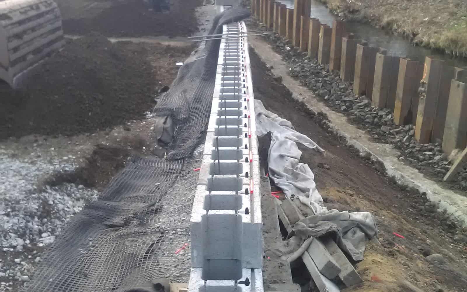 W ramach budowy nowego odcinka dwupasmowej drogi, łączącej się z drogami I/62 i I/13 w części miejscowości Děčín – Vilsnice, zaprojektowano mur oporowy z gruntu zbrojonego z licem z betonowych elementów.