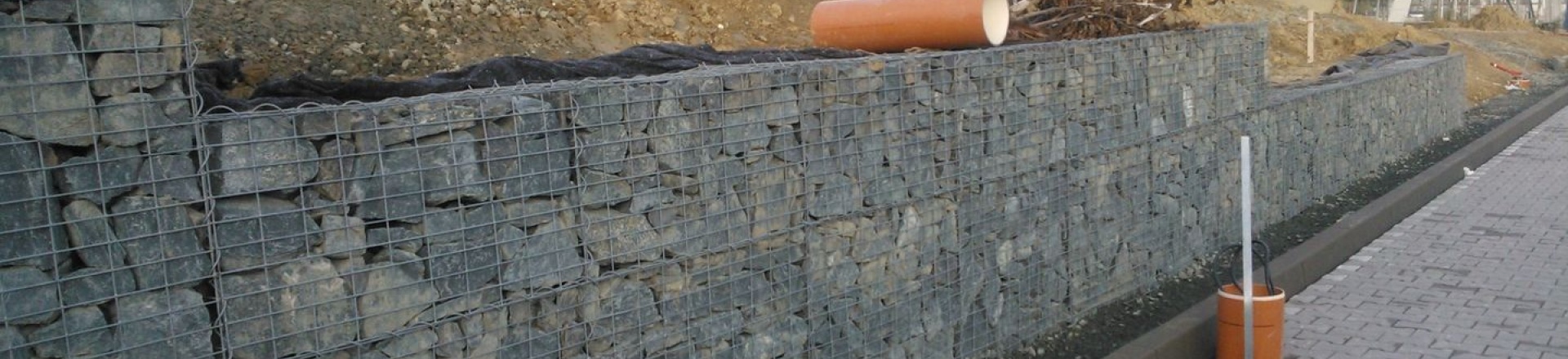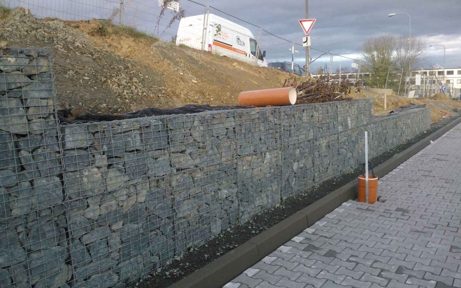 Gabionowy mur na terenie firmy Mercedes w Brnie