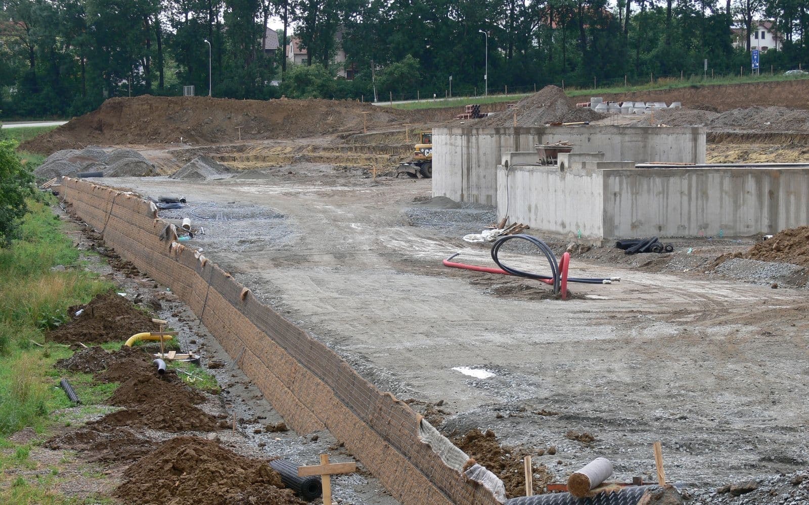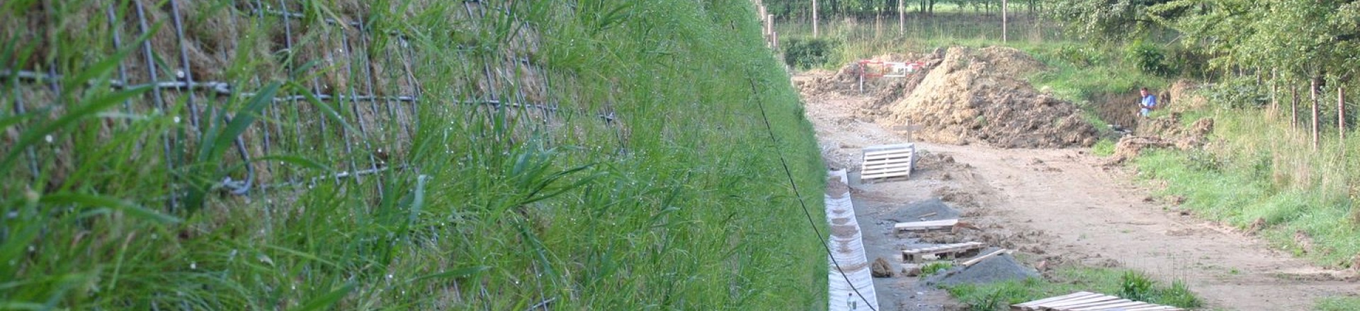 Z powodów przestrzennych (strefa ochronna wokół istniejącego gazociągu) nie było możliwe zastosowanie prostego skarpowania. Spełnienie wymaganej konfiguracji terenu wymagało zaprojektowania konstrukcji o nachyleniu 80°. Początkowo rozważano ścianę z gabionów lub betonu. Jako najtańsze rozwiązanie wybrano stromy stok z gruntu zbrojonego.