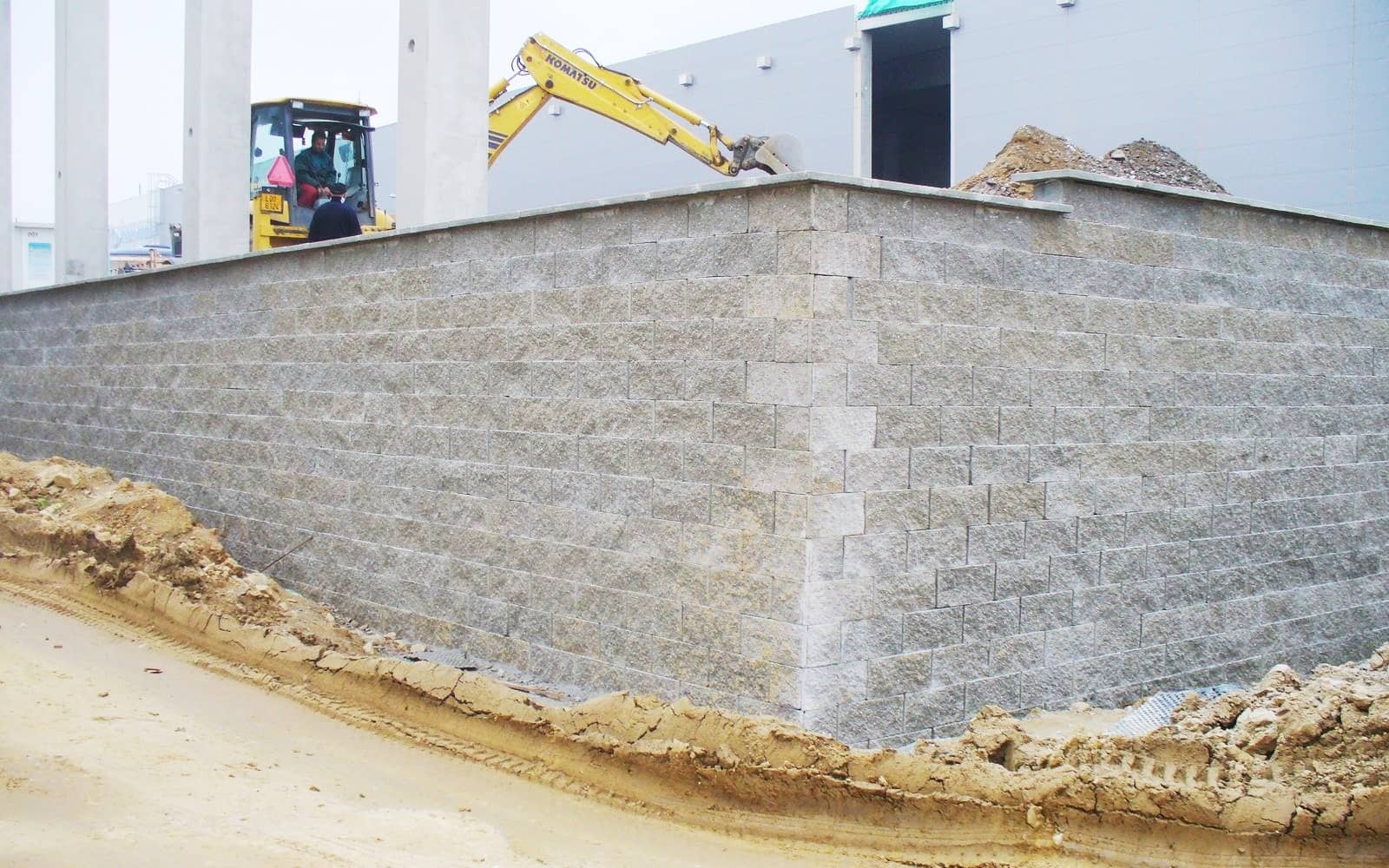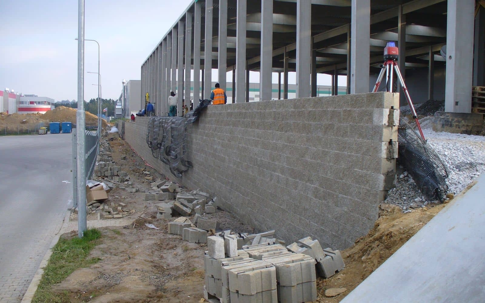 Zaprojektowana zbrojona konstrukcja oporowa pomogła rozwiązać różnicę wysokości między projektowaną drogą a nowo budowaną halą.