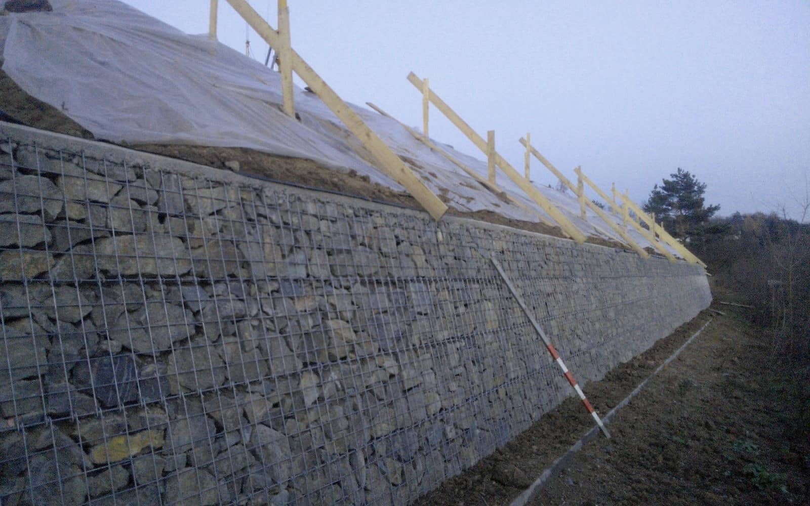 Na pochyłych działkach inwestor planował budowę domów jednorodzinnych, dlatego konieczne było wyrównanie terenu. Skarpa miała nachylenie 13–18°. Projektanci zdecydowali się na konstrukcję z gruntu zbrojonego z licem z kruszywa o nachyleniu 80°. Na tej konstrukcji został dodatkowo usypany zbrojony stok o nachyleniu 1:1.