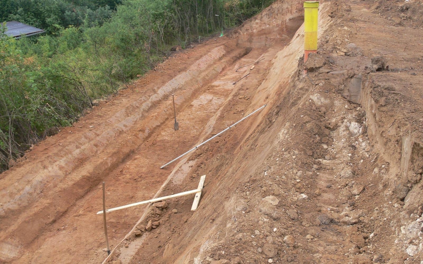Na pochyłych działkach inwestor planował budowę domów jednorodzinnych, dlatego konieczne było wyrównanie terenu. Skarpa miała nachylenie 13–18°. Projektanci zdecydowali się na konstrukcję z gruntu zbrojonego z licem z kruszywa o nachyleniu 80°. Na tej konstrukcji został dodatkowo usypany zbrojony stok o nachyleniu 1:1.