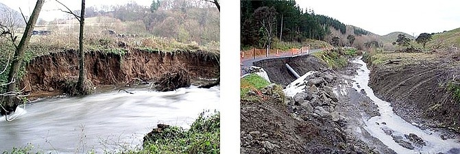 Innym częstym rodzajem jest erozja wywołana przez płynącą wodę, działającą długotrwale lub okresowo w sposób gwałtowny. Dotyczy to przede wszystkim obszarów narażonych na czasowe zalewanie wodą, oddziaływanie fal lub przerywany, szybko płynący nurt (np. brzegi rzek, wybrzeża, rowy, wały przeciwpowodziowe oraz przelewy zapór).