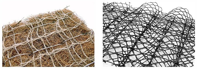 Główną zaletą trwałych mat przeciwerozyjnych (np. Trinter) w porównaniu z ochroną tymczasową jest to, że bezpośrednio współpracują one z darnią trawiastą (korzenie są chronione przez geosyntetyk) oraz nie ulegają degradacji biologicznej (spełniają swoją funkcję przez cały okres użytkowania konstrukcji).