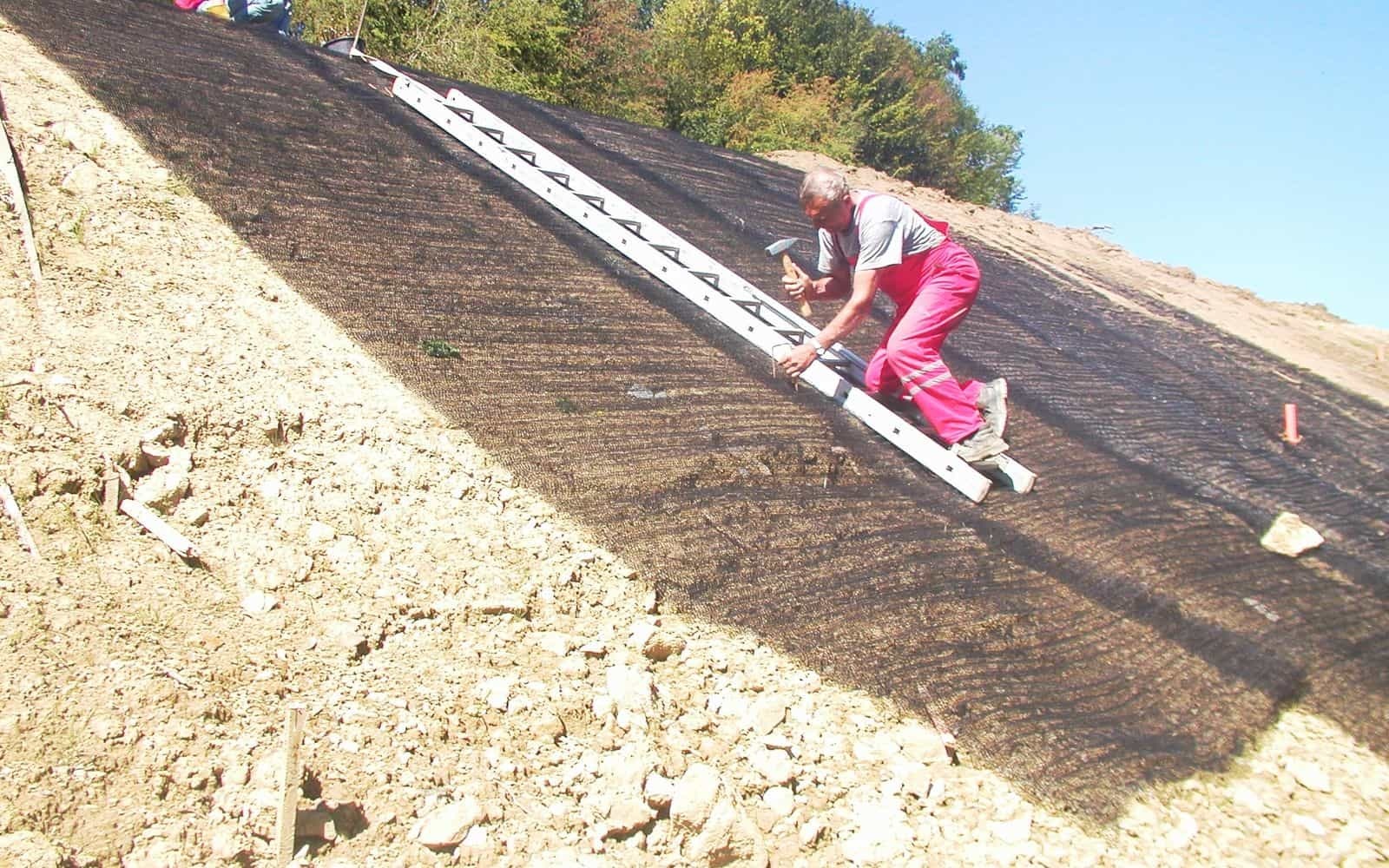 Nowo wybudowany nasyp drogowy miał takie nachylenie, że pod wpływem opadów dochodziło do erozji wodnej. Aby temu zapobiec, na powierzchni skarpy ułożono trwałą przeciwerozyjną georohoż w celu jej wzmocnienia.