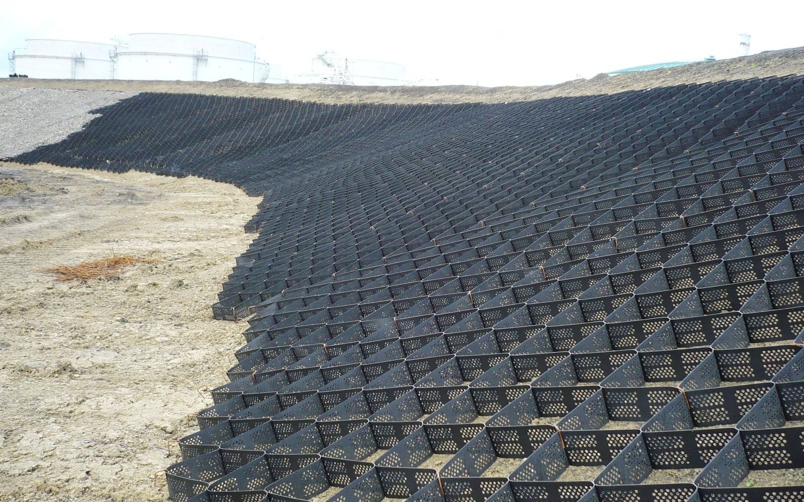 Operator cukrowni wymagał skutecznej ochrony przeciwerozyjnej skarpy nowo budowanego zbiornika sedymentacyjnego, który będzie okresowo zalewany odpadkowymi osadami z produkcji cukru.