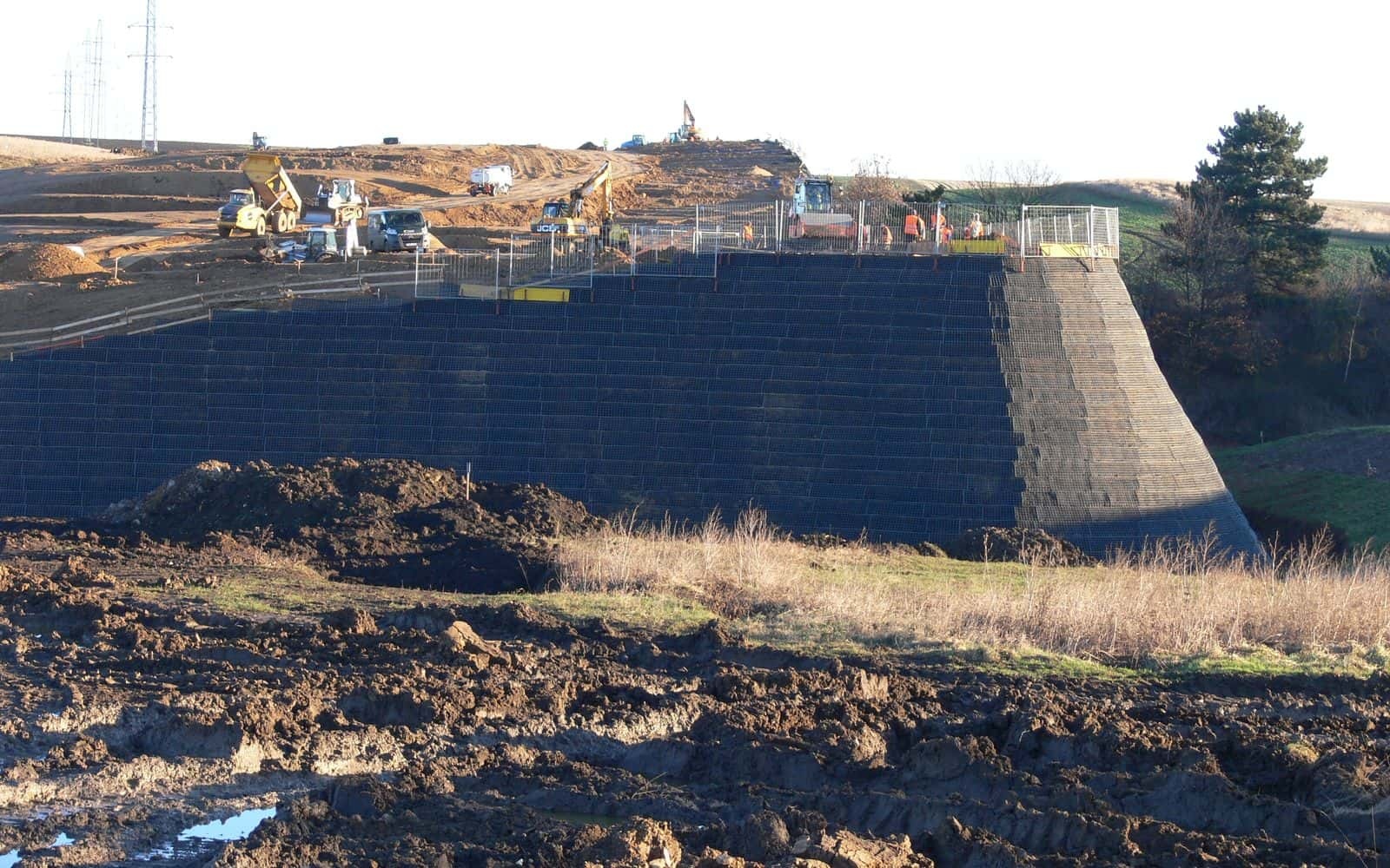 Gmina Březno koło Chomutova cierpiała z powodu obniżonej jakości powietrza oraz podwyższonego poziomu hałasu związanego z eksploatacją pobliskiej kopalni węgla brunatnego. Aby ograniczyć te negatywne oddziaływania na mieszkańców, wybudowano wysoki ochronny wał ziemny z gruntu zbrojonego z zielonym licem. Obiekt jest interesujący nie tylko ze względu na swoją wysokość, ale przede wszystkim dzięki zakrzywionemu rzutowi oraz zmiennemu nachyleniu lica na długości konstrukcji, co potwierdza dużą kształtową elastyczność modułowego systemu zbrojonych stromych zboczy.
