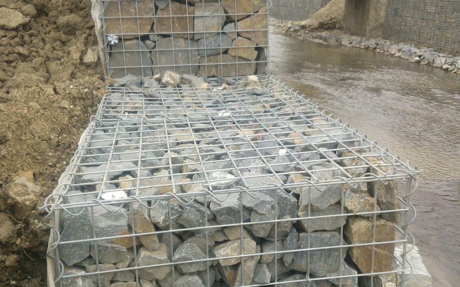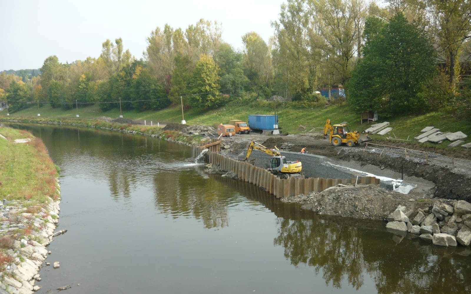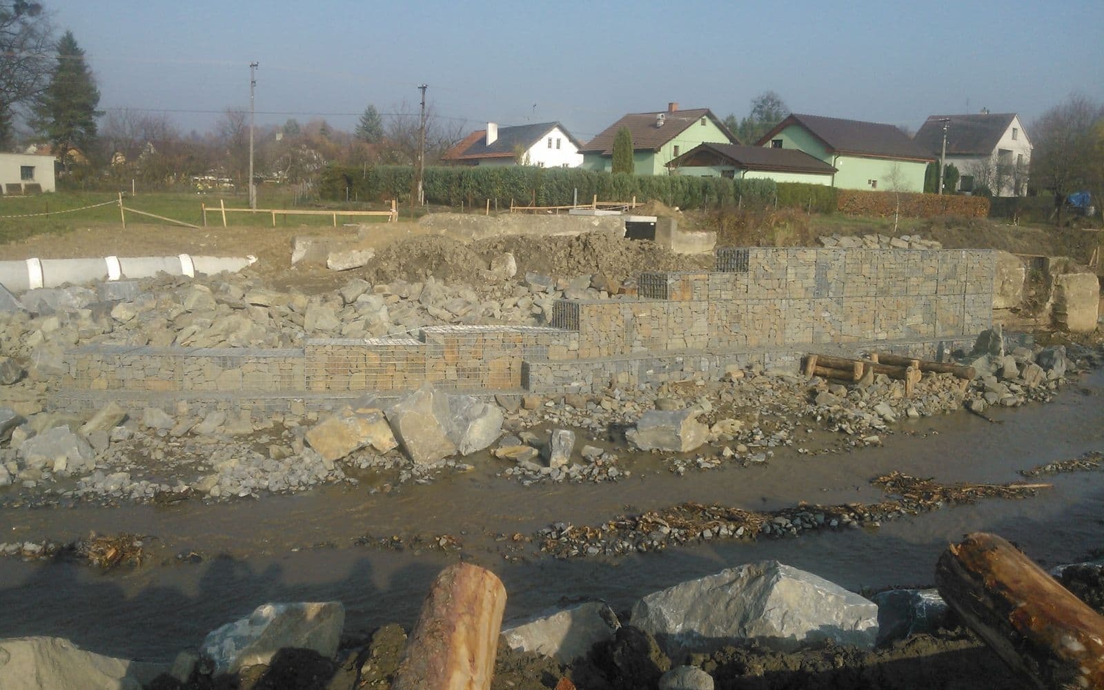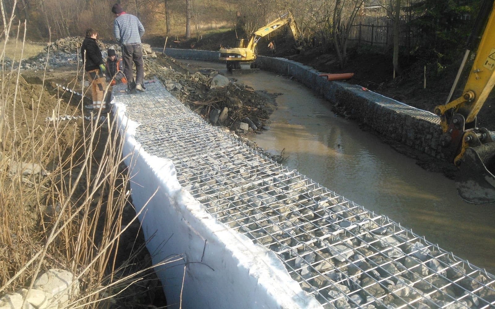 Odbudowa koryta potoku po powodniach za pomocą murów gabionowych w Závišicach