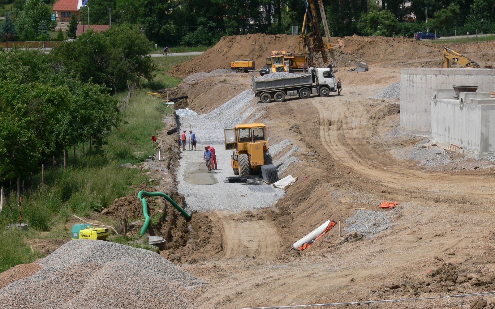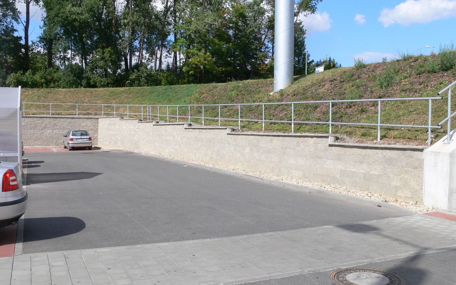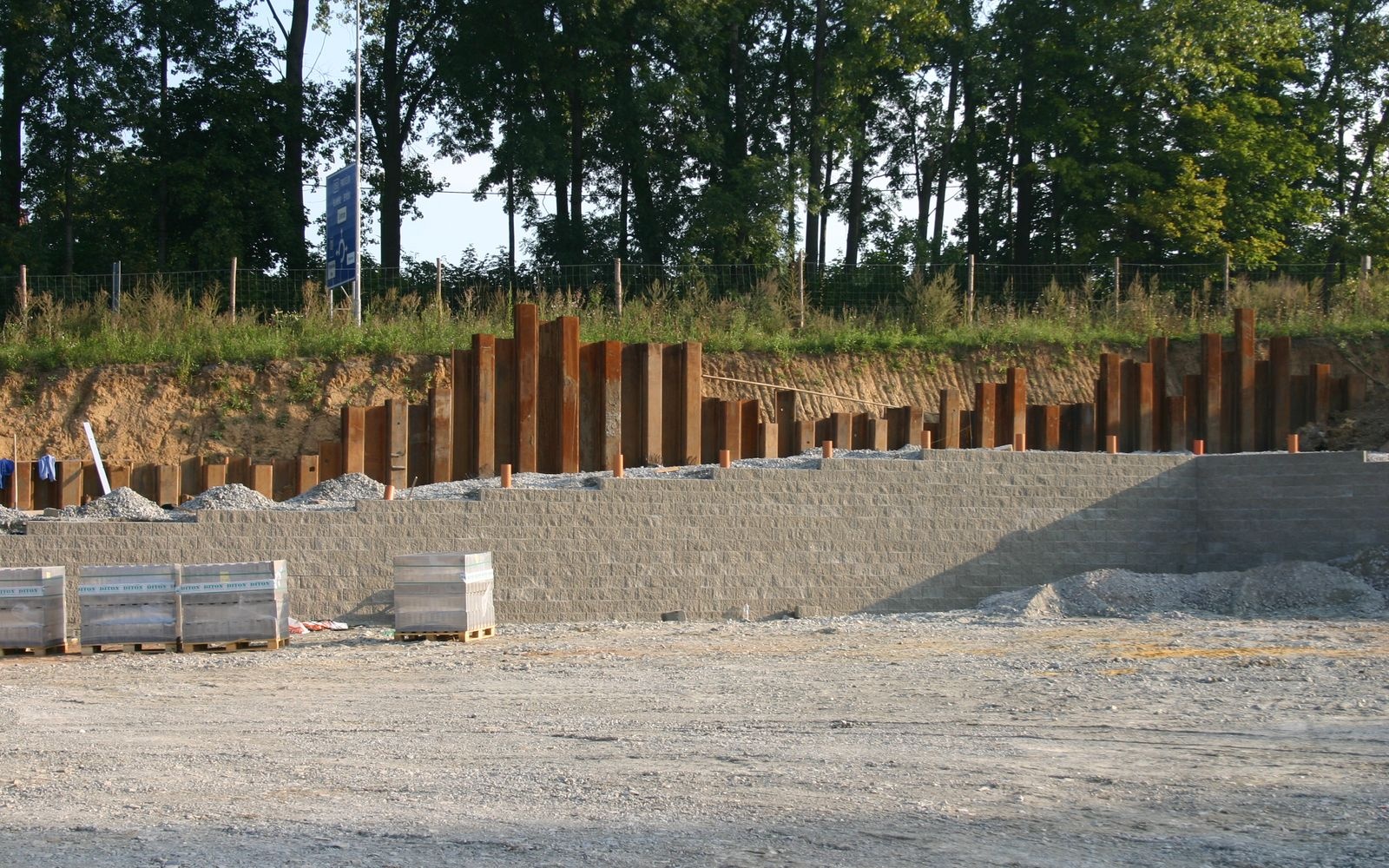 Ze względów przestrzennych (strefa ochronna wokół istniejącego gazociągu) nie było możliwe wykonanie zwykłego skarpowania. Spełnienie wymaganej dyspozycji wymagało konstrukcji o nachyleniu 80°. Początkowo rozważano ścianę z gabionów lub betonu. Jako najtańsze rozwiązanie wybrano strome zbocze ze wzmocnionego gruntu. Podłoże zostało ulepszone za pomocą mechanicznie stabilizowanej warstwy, która jednocześnie odprowadza wodę z podstawy fundamentu. Strome zbocze z systemu Tensartech GreenSlope ma długość 152 m z dwoma załamaniami kierunkowymi. Wysokość zbocza jest zmienna (od 0,7 m do 6,9 m). Nachylenie nadnasypu nad zboczem wynosi 1:1,75 i osiąga wysokość do 5,8 m. Na koronie zbocza zainstalowano barierkę bezpieczeństwa.