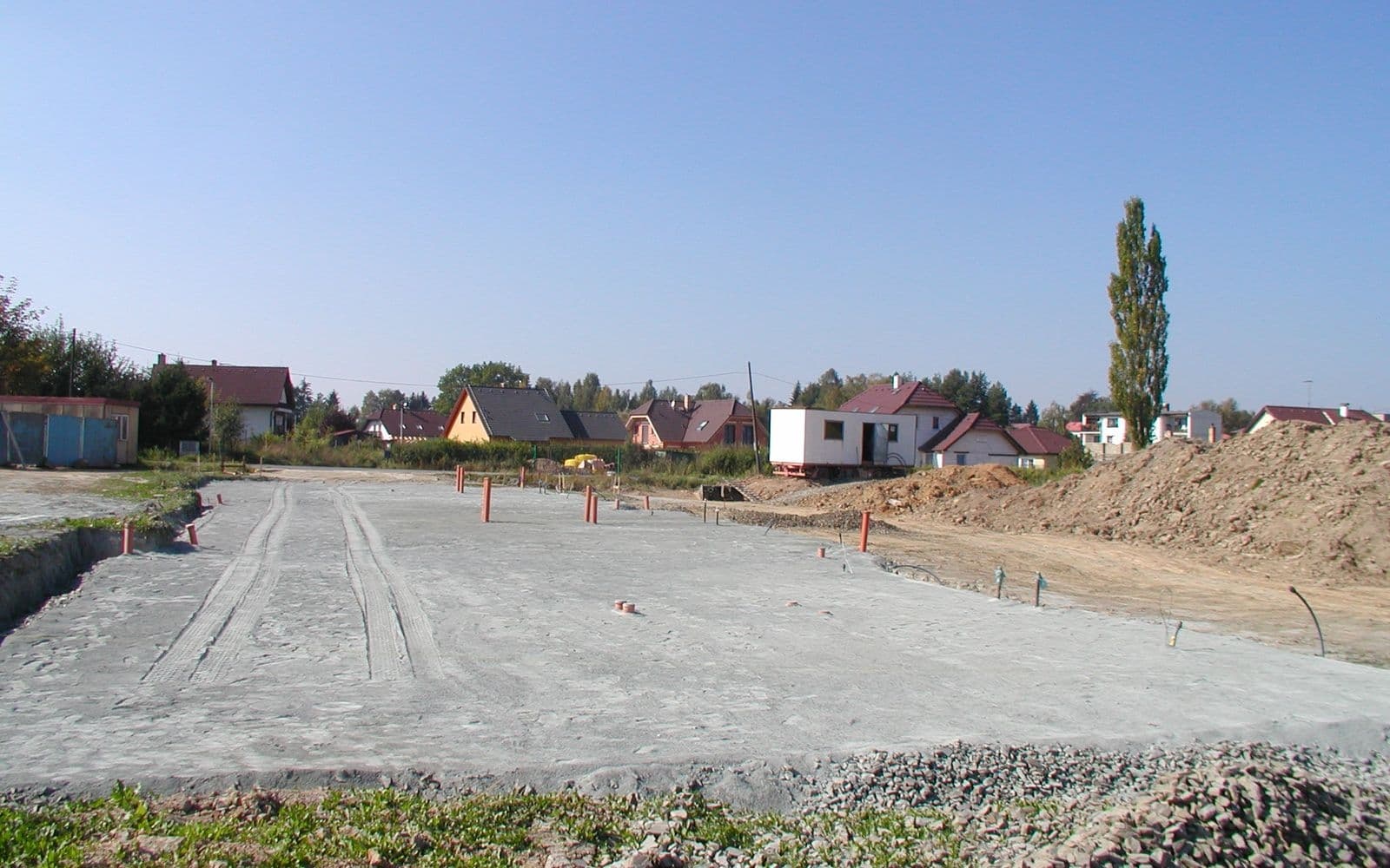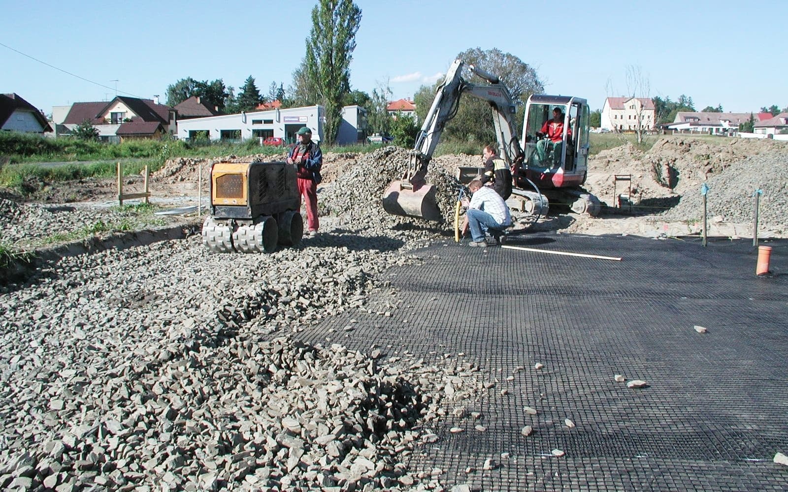 Posadowienie szeregowych domów jednorodzinnych na podłożu z wysokim poziomem wód gruntowych (0,5–1,2 m). Rozwiązaniem była stabilizacja podłoża za pomocą geosiatek zbrojeniowych w połączeniu z geowłókninami filtracyjnymi i ochronnymi.