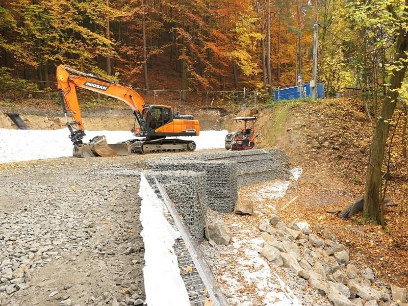 Ze względu na kontakt z geosyntetycznym zbrojeniem zastosowano gruboziarnisty materiał sypki typu 2 zgodnie z normą ČSN EN 14475, zagęszczony do wymaganej wartości (minimum ID = 0,85), przy technologicznej warstwie maksymalnie 300 mm, co odpowiada połowie modułowej wysokości umocnienia lica. Efektywny kąt tarcia wewnętrznego materiału wynosi minimum 32°, a maksymalna wielkość ziarna to 63 mm.
