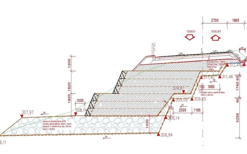 W pierwszej fazie budowa była realizowana w miejscu istniejącego przepustu (rys. 5), następnie postępowała w kierunku skrzyżowania dróg. Po budowie nowego przepustu wykonano również nowe nasypowe ciało, zaprojektowane jako konstrukcja oporowa z gruntu zbrojonego o nachyleniu lica 60°. Projekt opierał się na zasadach dla konstrukcji z gruntu zbrojonego zgodnie z przepisami Ministerstwa Transportu RC TP 97 i normą ČSN EN 1997-1.