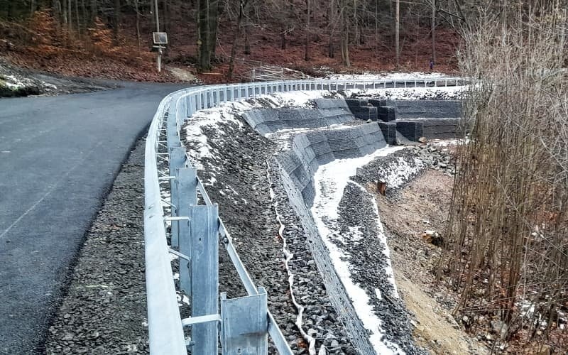 Na krytycznym odcinku dochodziło do rozwoju niestabilności zbocza, co wymagało szybkiej naprawy i realizacji konstrukcji oporowej. Została ona wykonana jako wzmocniona konstrukcja ziemna w trzech poziomych tarasach w połączeniu z warstwą drenażową.