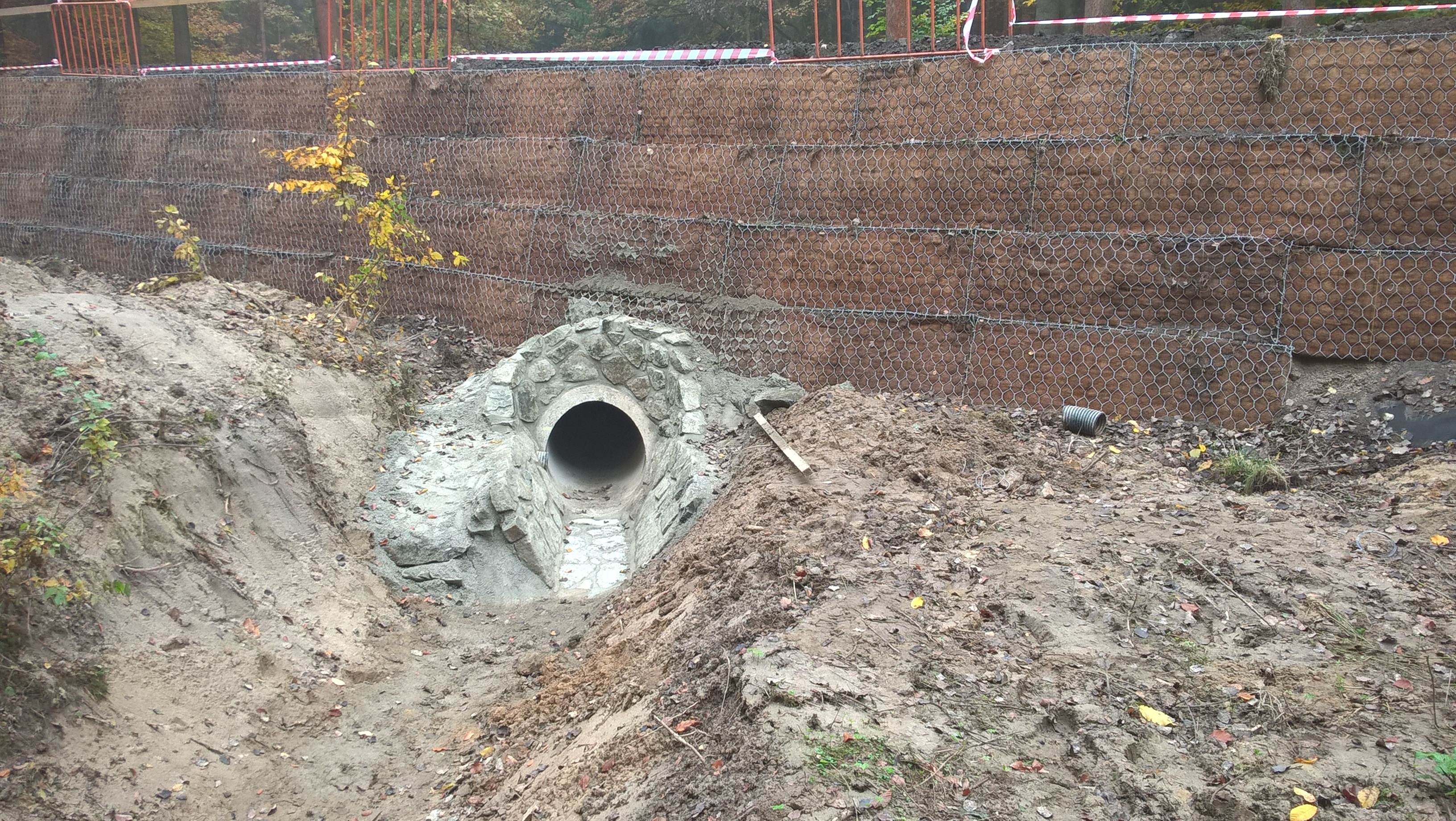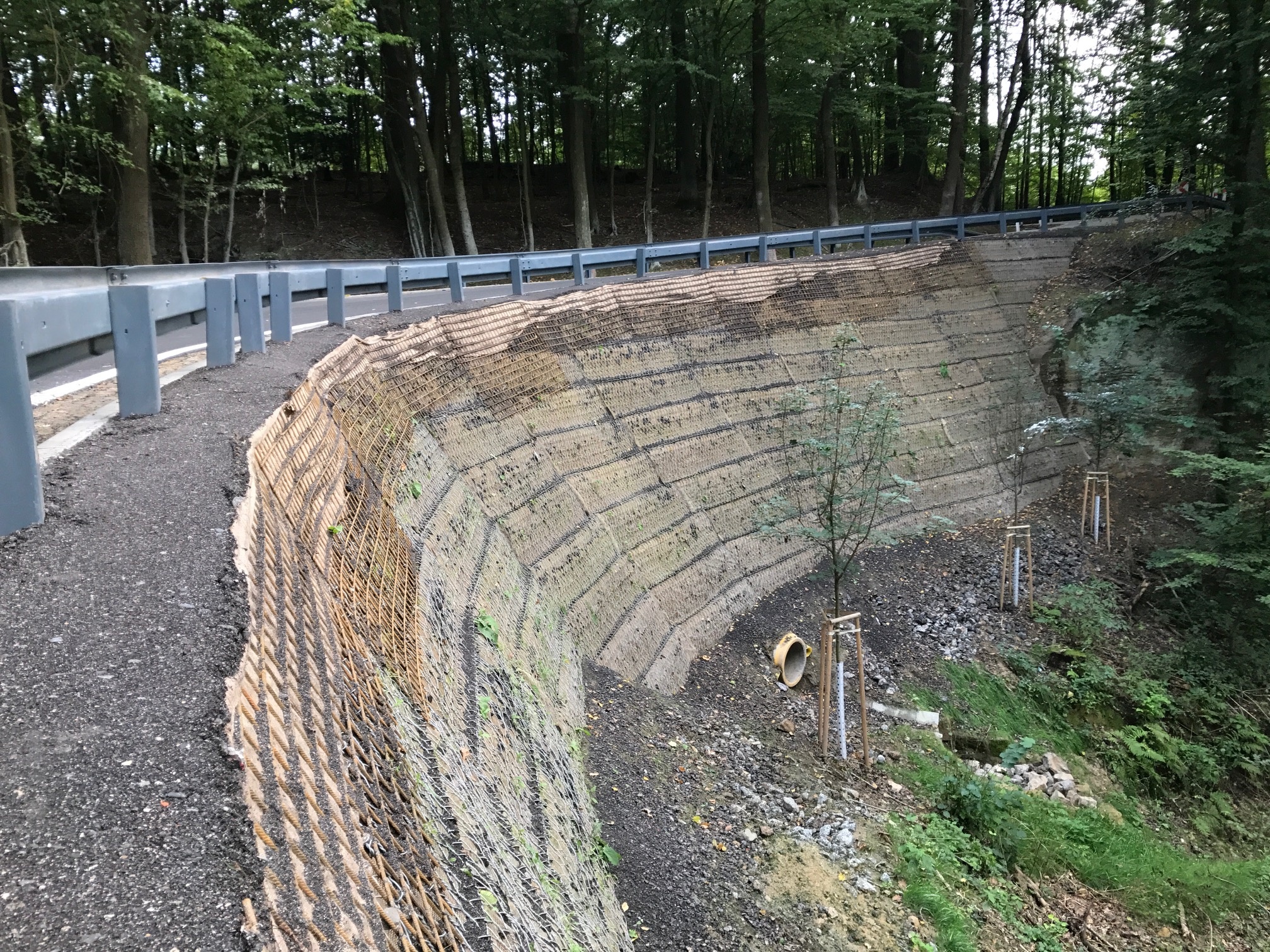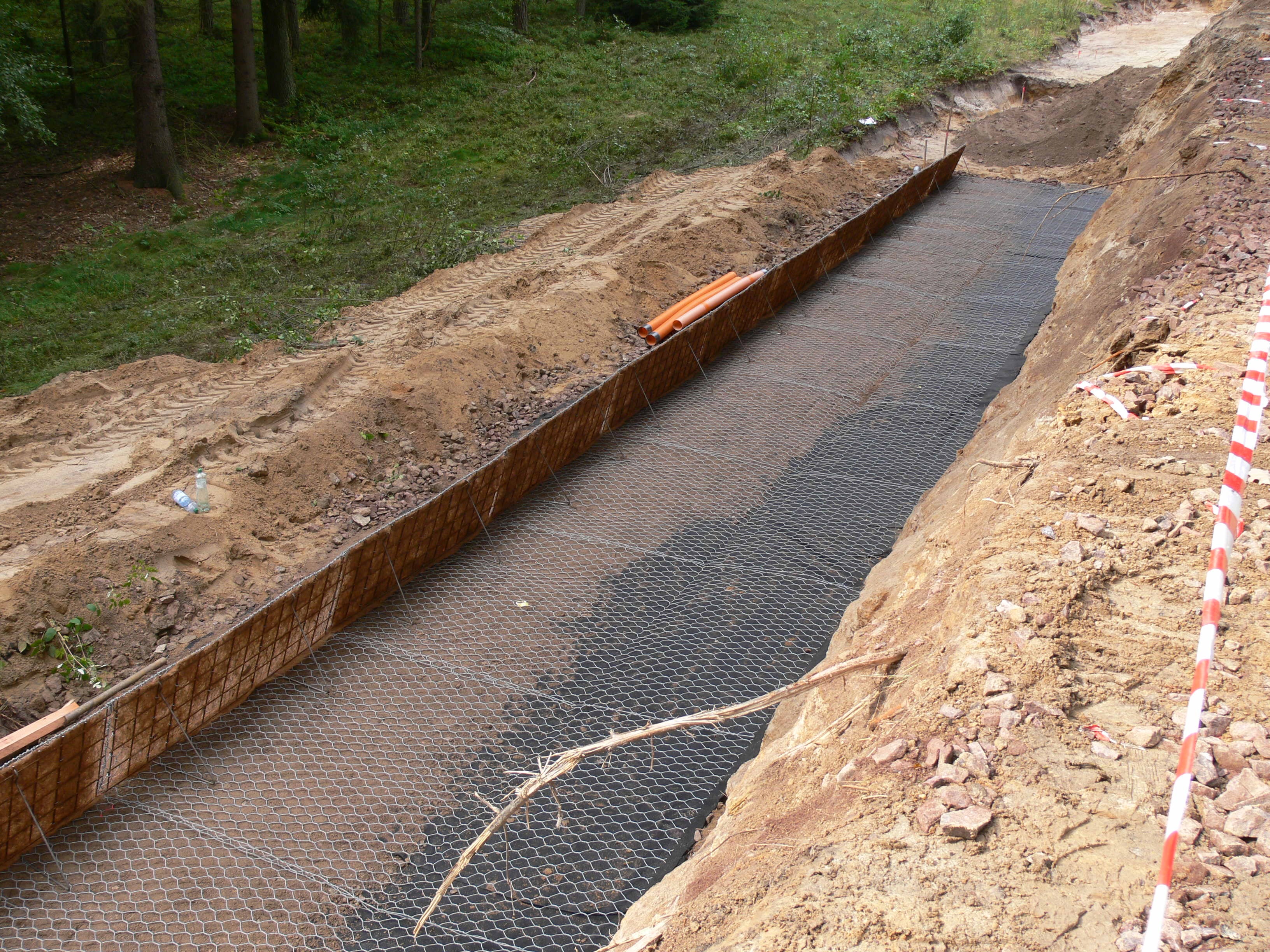 Podczas rekonstrukcji drogi III/28115 zaprojektowano jej poszerzenie w celu zamontowania barier ochronnych zgodnie z obowiązującymi przepisami. Ze względu na ograniczoną przestrzeń wybrano rozwiązanie z zastosowaniem gruntu zbrojonego o nachyleniu lica 70°, który zastępuje istniejący kamienny mur.